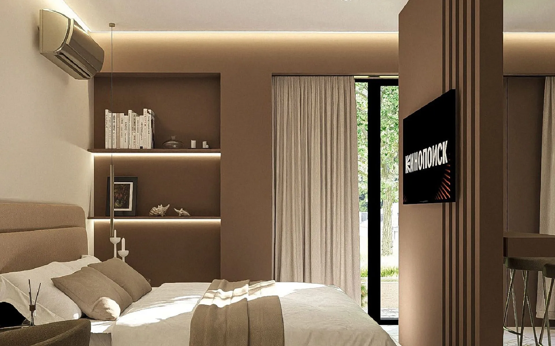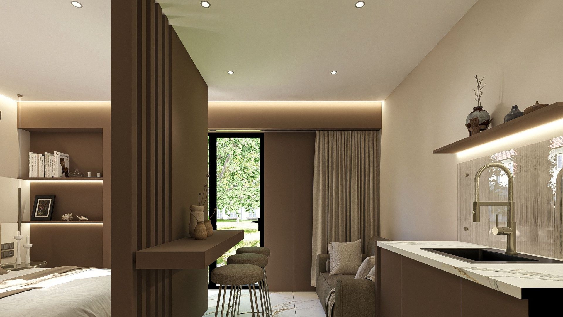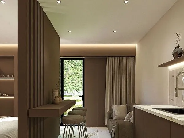 25-30 м2Номер с зонирующей перегородкой, между спальной зоной и кухней, большой зеленой террасой.С балконом