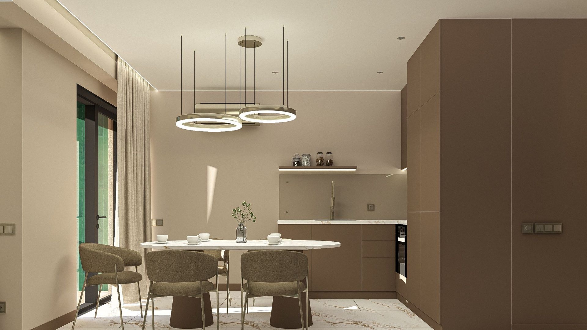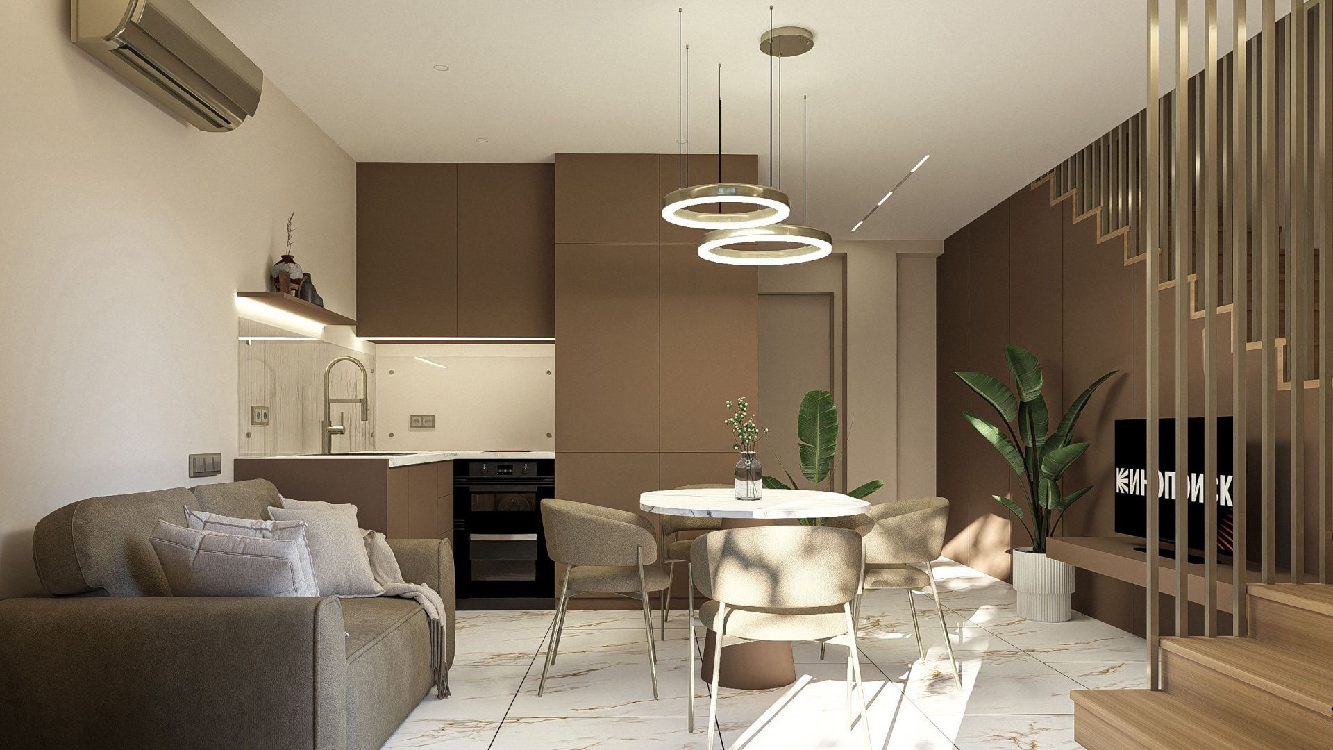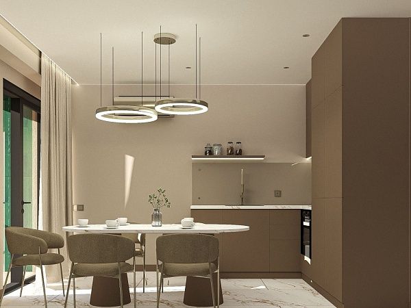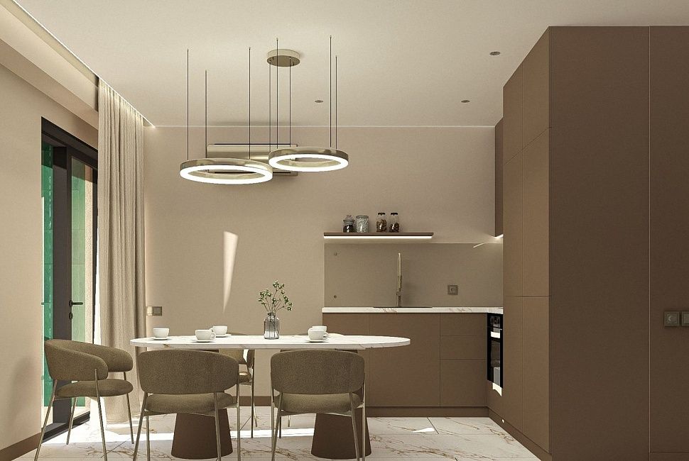 Двухуровневые апартаменты. Первый уровень - кухня, гостиная с диваном и балконом.