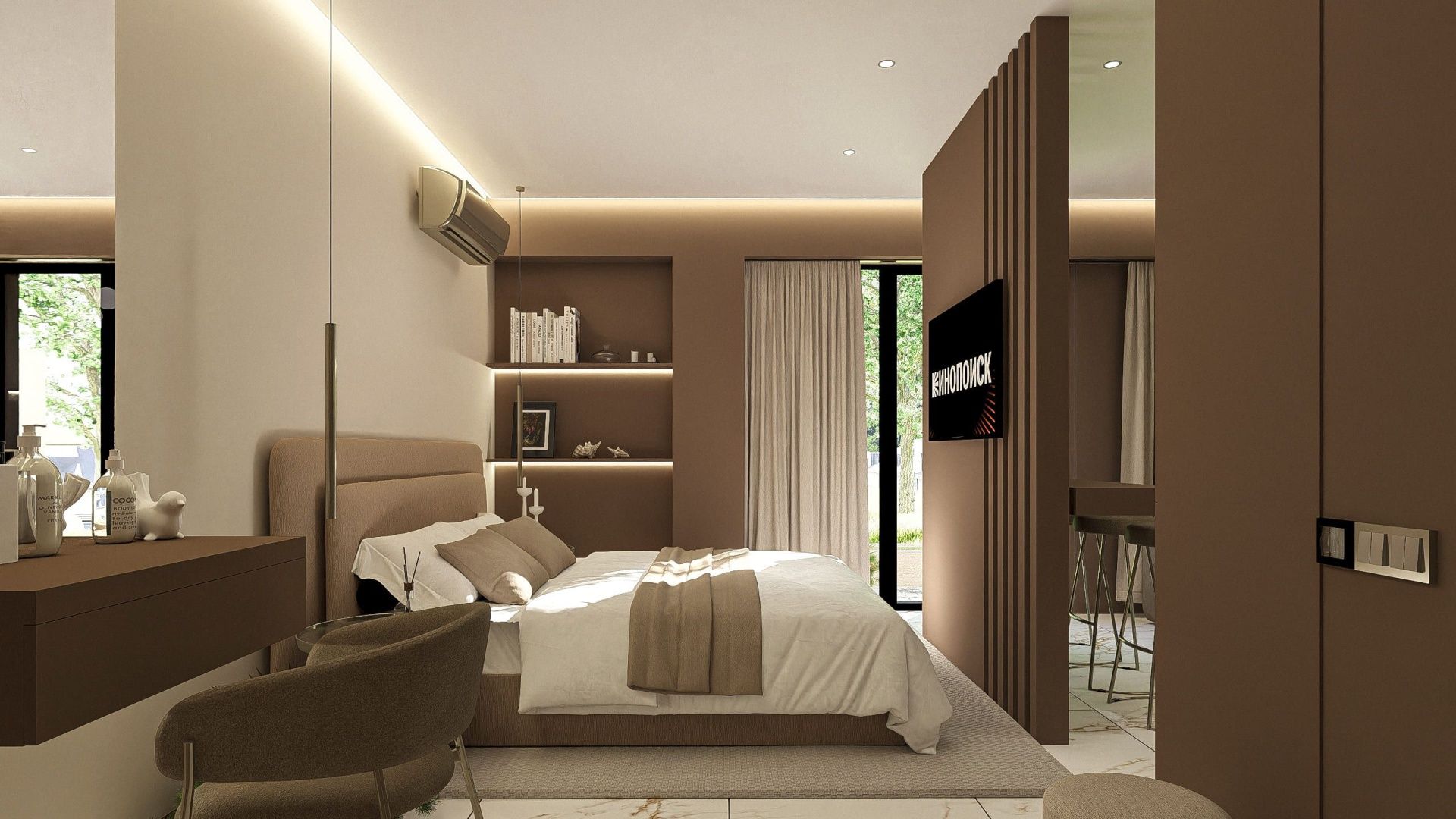 Второй уровень - спальня с кроватью king size, диваном и балконом.