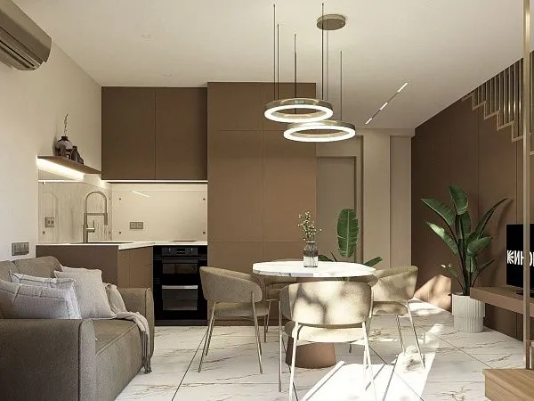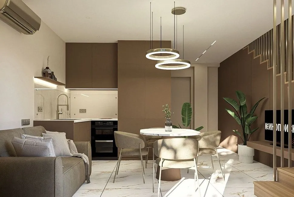 75 м2Двухуровневые апартаменты. Первый уровень - кухня, гостиная с диваном и балконом. Второй уровень – две изолированные спальни: спальня с кроватью king size и спальня с двумя single кроватями и балконом.С балконом