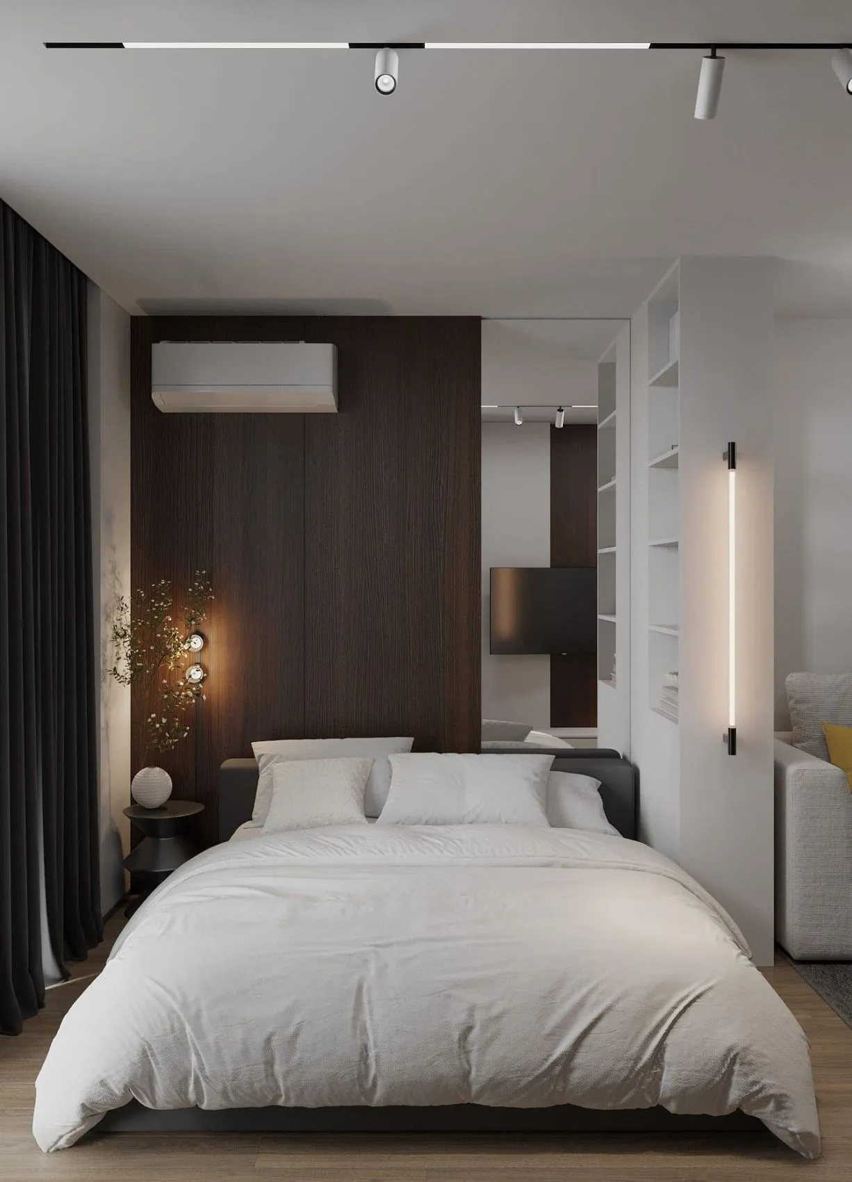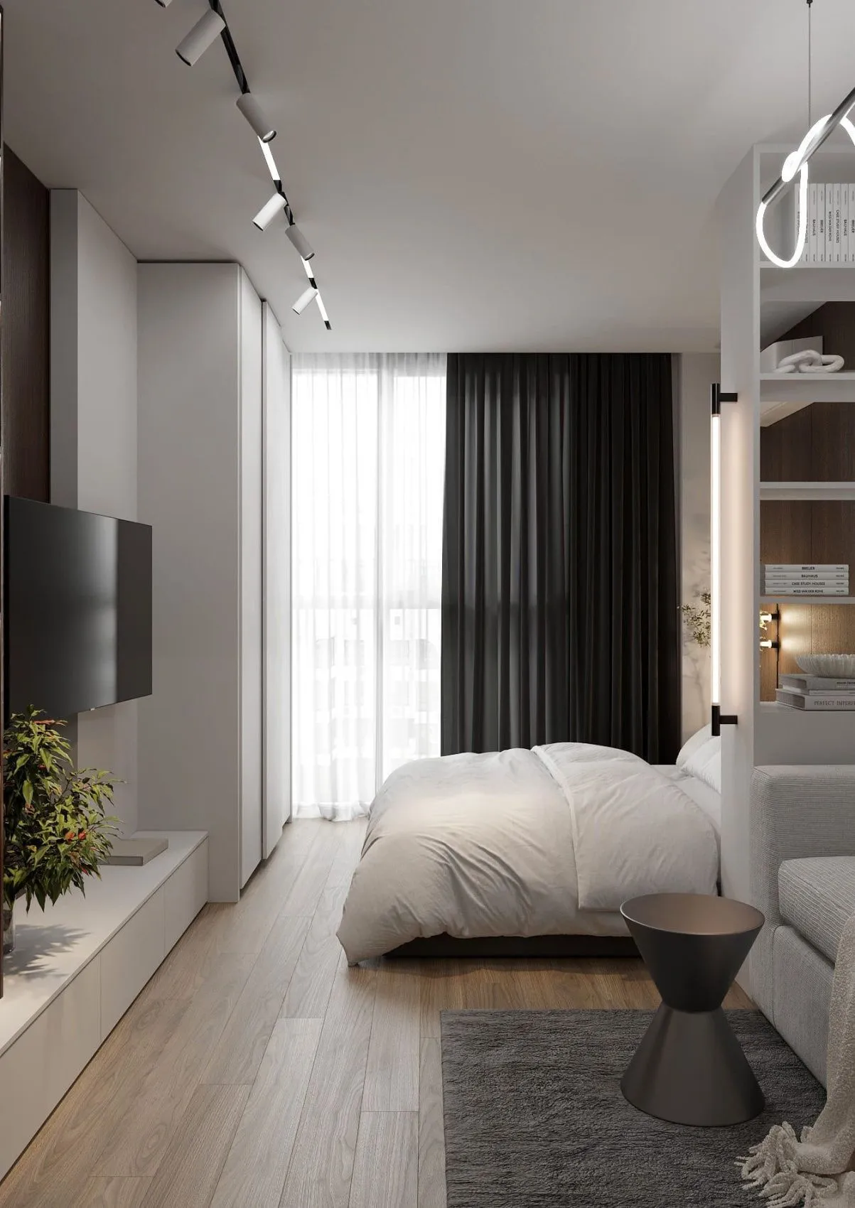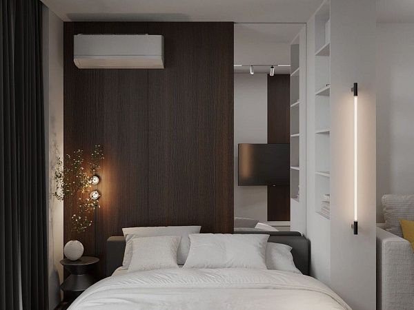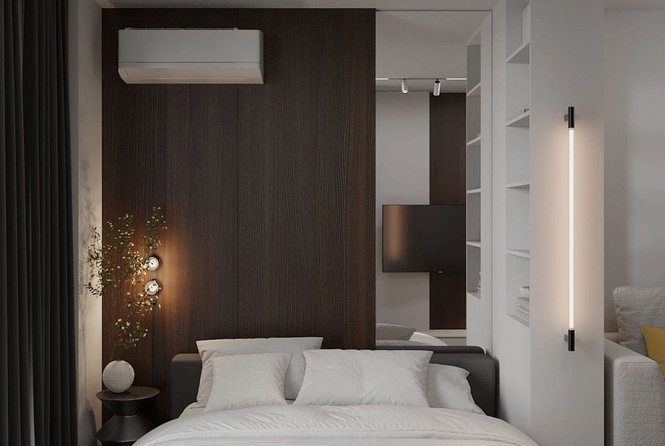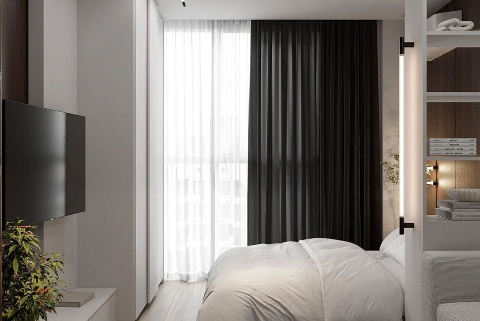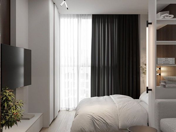 Современная планировка с разделением активных зон со спальной зоной. Окна на две стороны с закатами