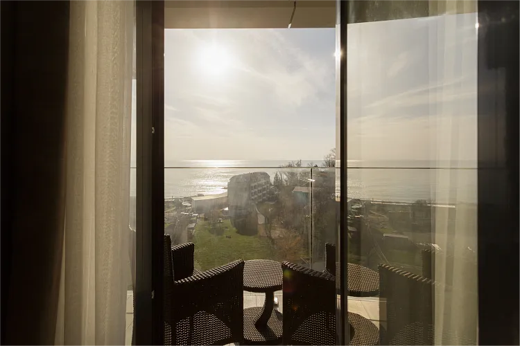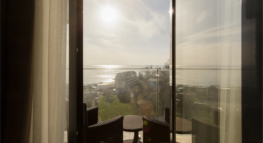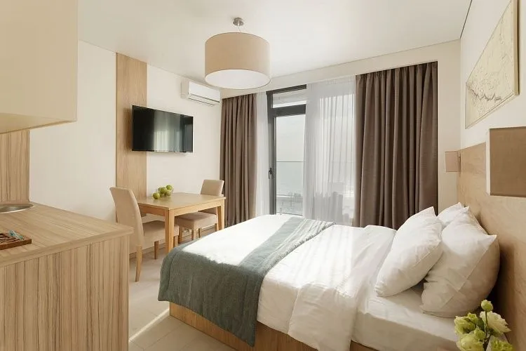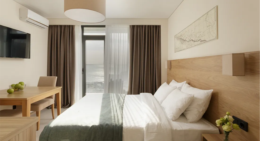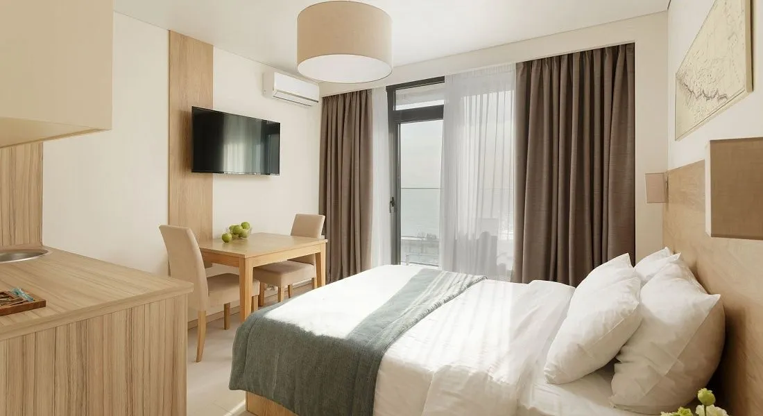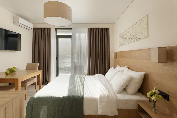 Студия вид на море площадью 17 кв. м. для комфортного размещения двух человек, с панорамными окнами. В номере расположена двуспальная кровать, кухонная зона. Балкон с летней мебелью.