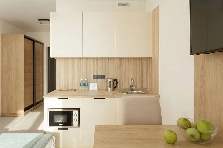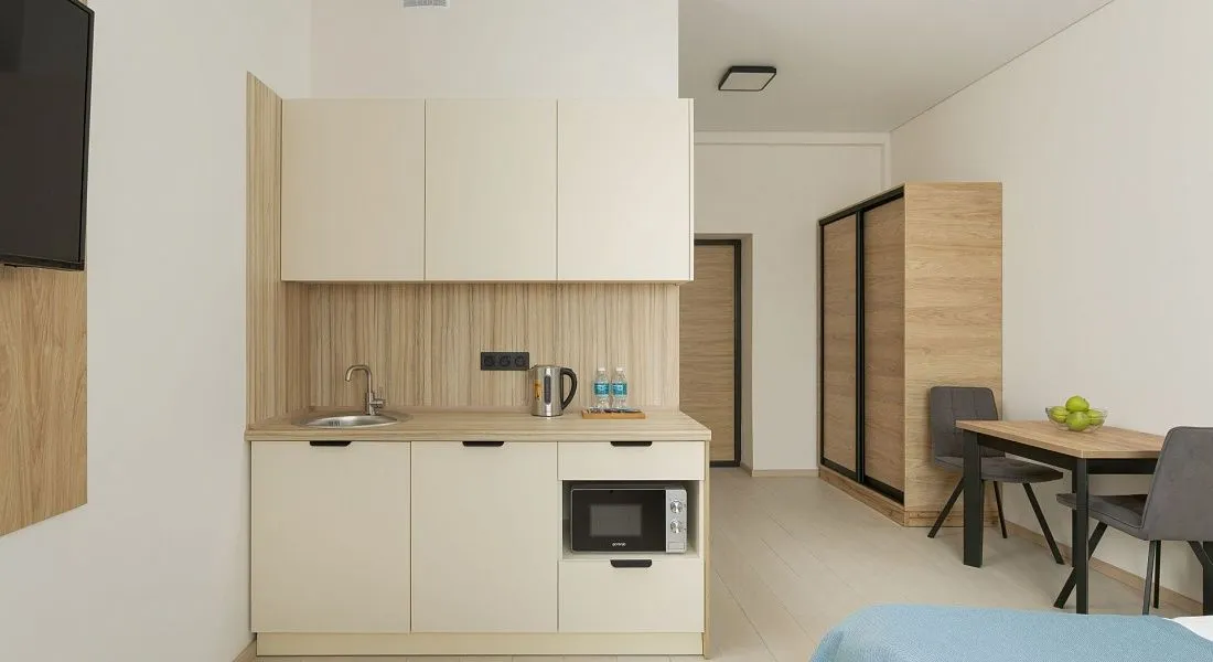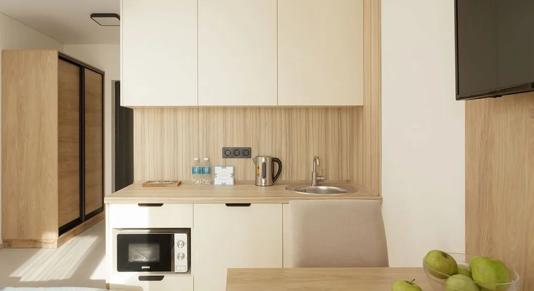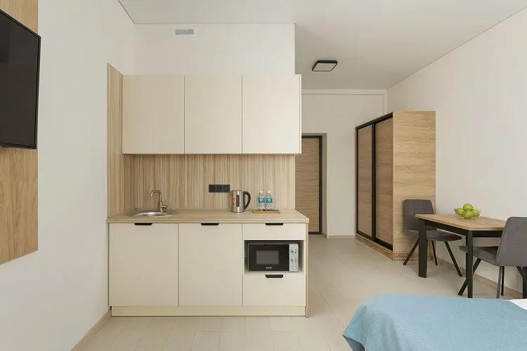 Студия вид на бассейн площадью 17 кв. м. для комфортного размещения двух человек, с панорамными окнами. В номере расположена двуспальная кровать, кухонная зона. Балкон с летней мебелью.