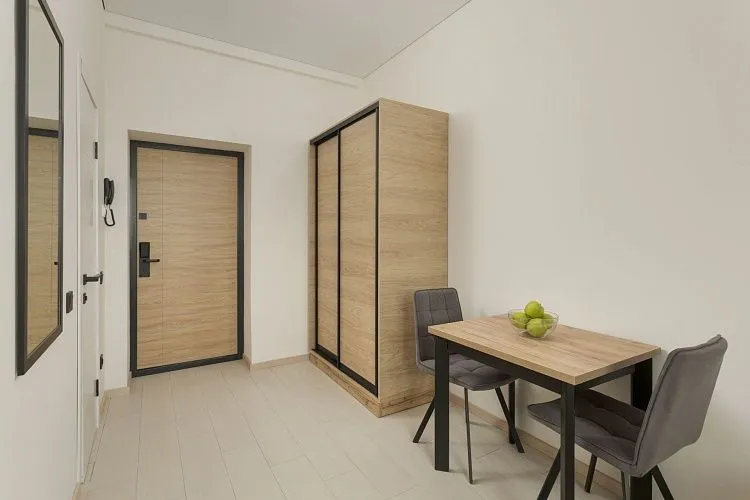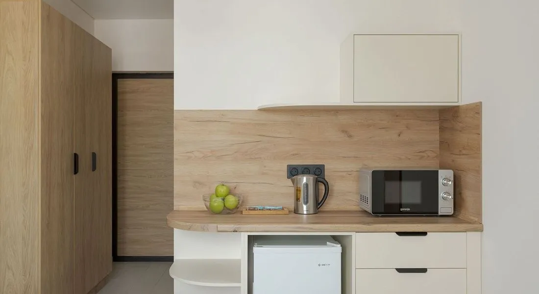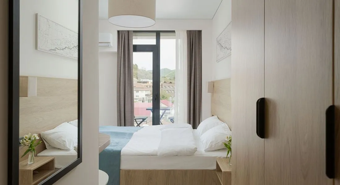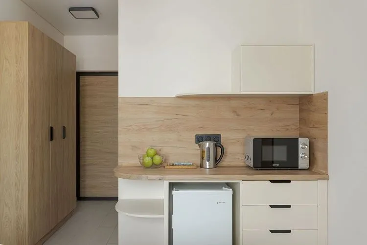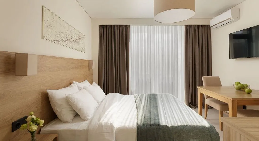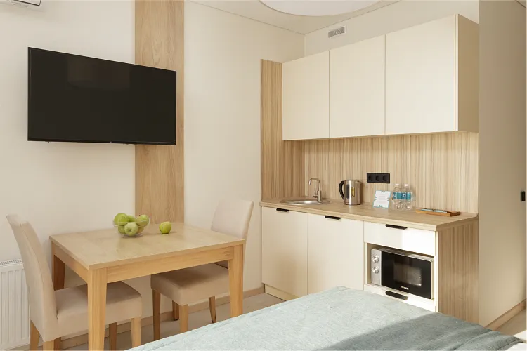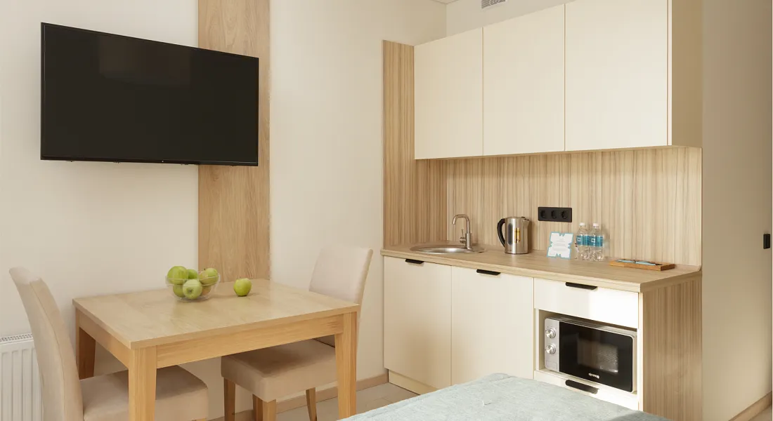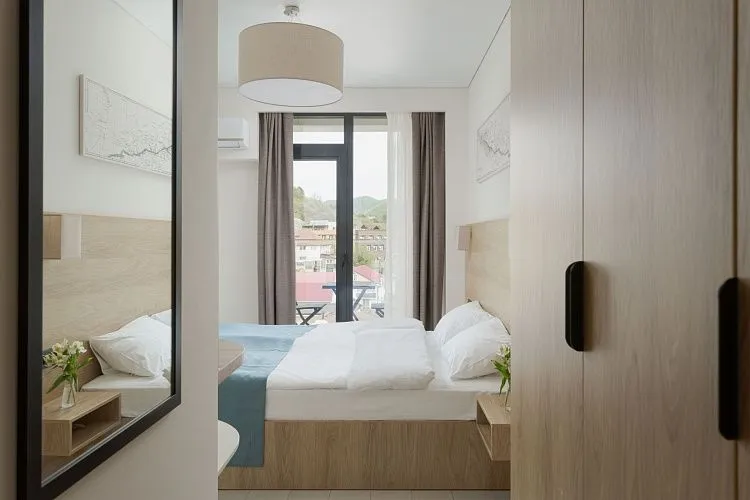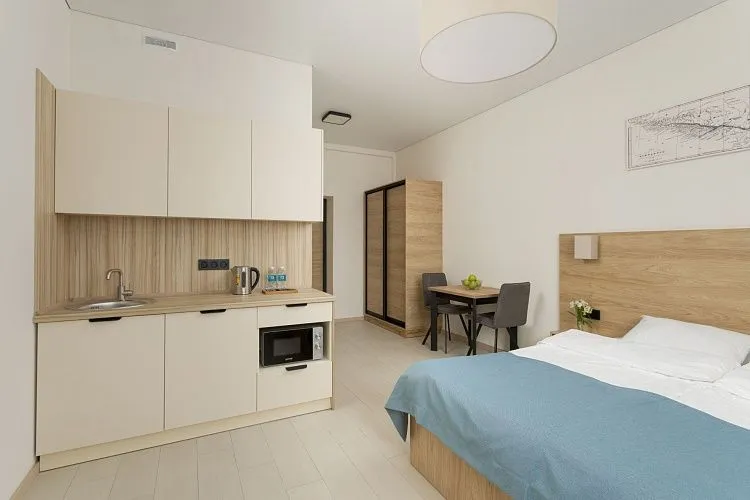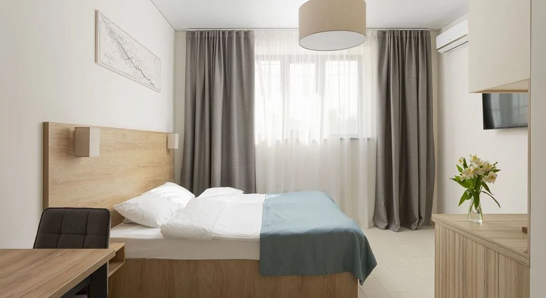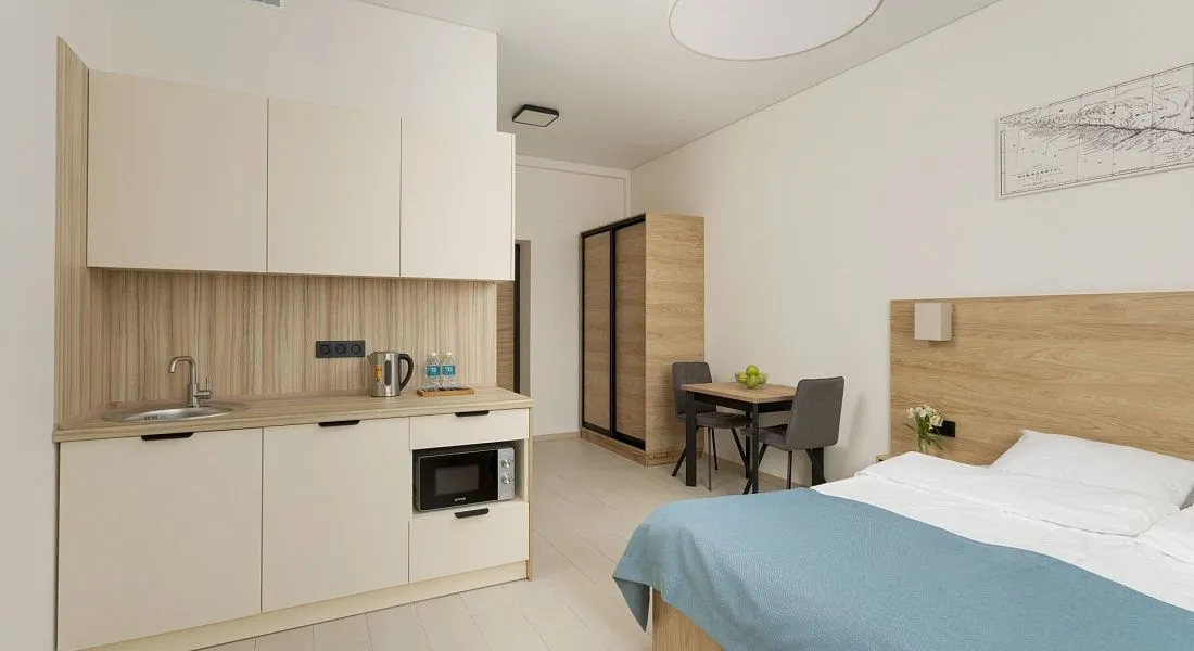 Стандарт площадью 18-23 кв. м. для комфортного размещения двух человек. В номере расположена двуспальная кровать, обеденная и кухонная зона.